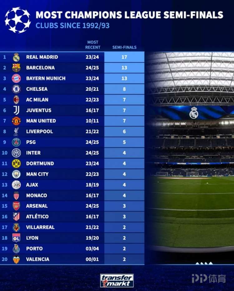 歐冠1/4決賽次回合即將打響,德轉(zhuǎn)也盤點了自92/93賽季歐冠改制以來,進入4強次數(shù)榜以及各支球隊上次進入4強的賽季,具體如下: