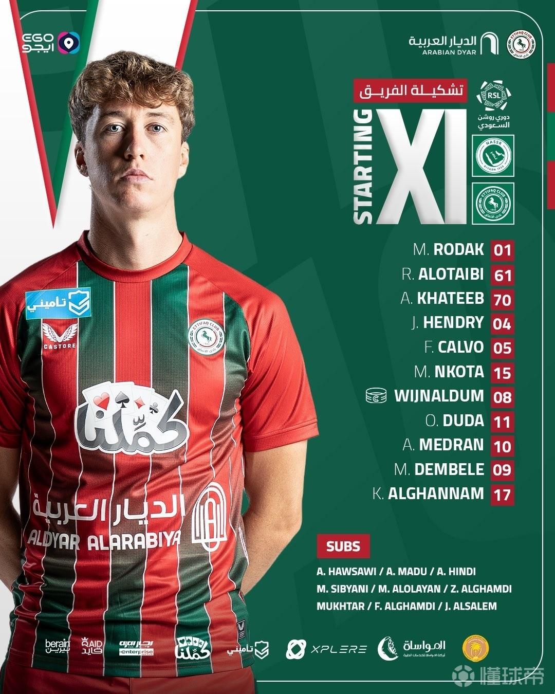 達(dá)曼協(xié)作首發(fā):1-羅達(dá)克、61-奧泰比、70-哈提卜、4-亨德利、5-卡爾沃、15-恩科塔、8-威納爾杜姆、10-梅德蘭、11-杜達(dá)、17-哈立德-加納姆、9-穆薩-登貝萊