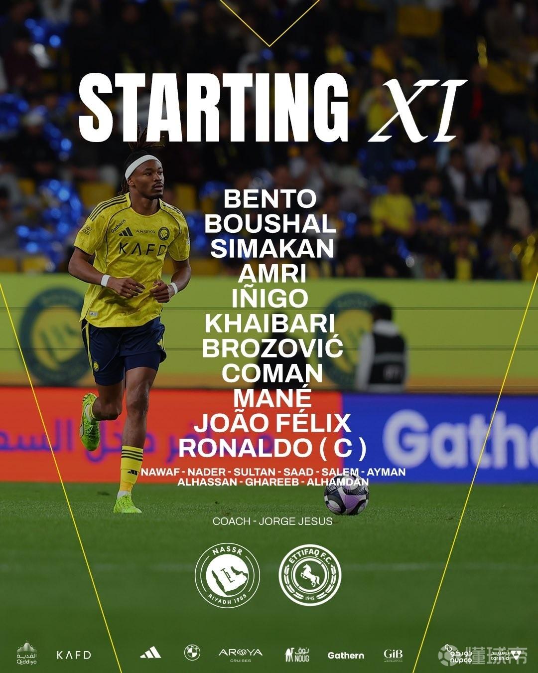 利雅得勝利首發(fā):24-本托、26-伊尼戈-馬丁內(nèi)斯、5-阿卜杜拉-阿姆里、3-西馬坎、12-納瓦夫-布歇爾、10-馬內(nèi)、17-阿卜杜拉-海巴里、11-布羅佐維奇、21-金斯利-科曼、7-C羅、79-菲利克斯