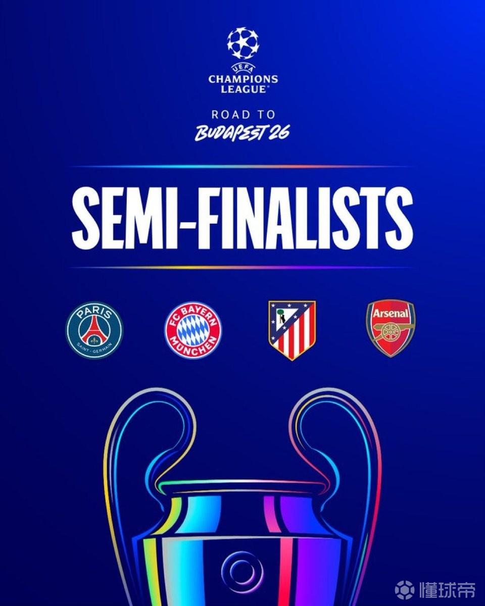 歐冠1/4決賽次回合全部戰(zhàn)罷,沒有出現(xiàn)逆轉(zhuǎn)的情況,首回合領(lǐng)先的四支球隊(duì)全部順利晉級(jí)半決賽。