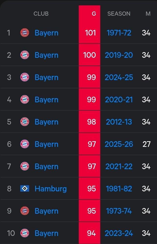 6.拜仁慕尼黑 97球 2025-26賽季 27輪比賽(本賽季德甲還剩7輪)