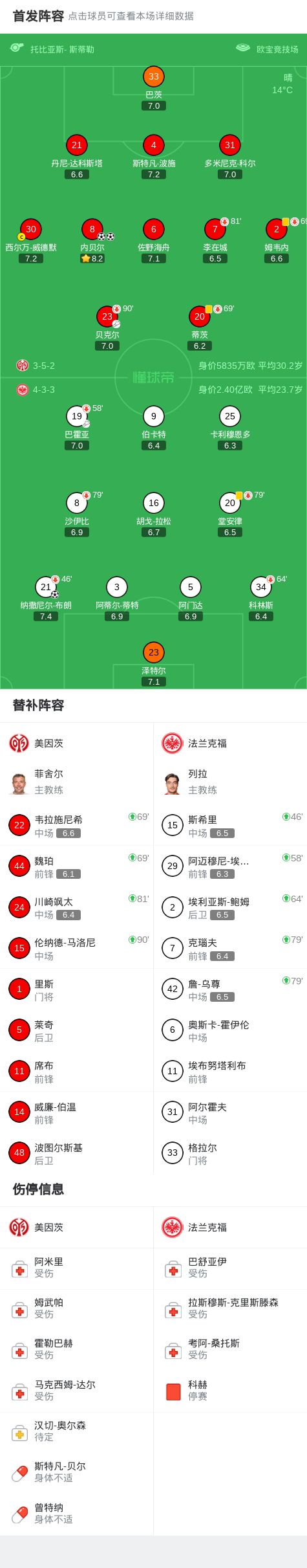 北京時(shí)間3月22日德國(guó)足球頂級(jí)聯(lián)賽 聯(lián)賽 第27輪,美因茨主場(chǎng)對(duì)陣法蘭克福。美因茨內(nèi)貝爾梅開二度。法蘭克福納撒尼爾-布朗破門。最終比分美因茨 2-1 法蘭克福。