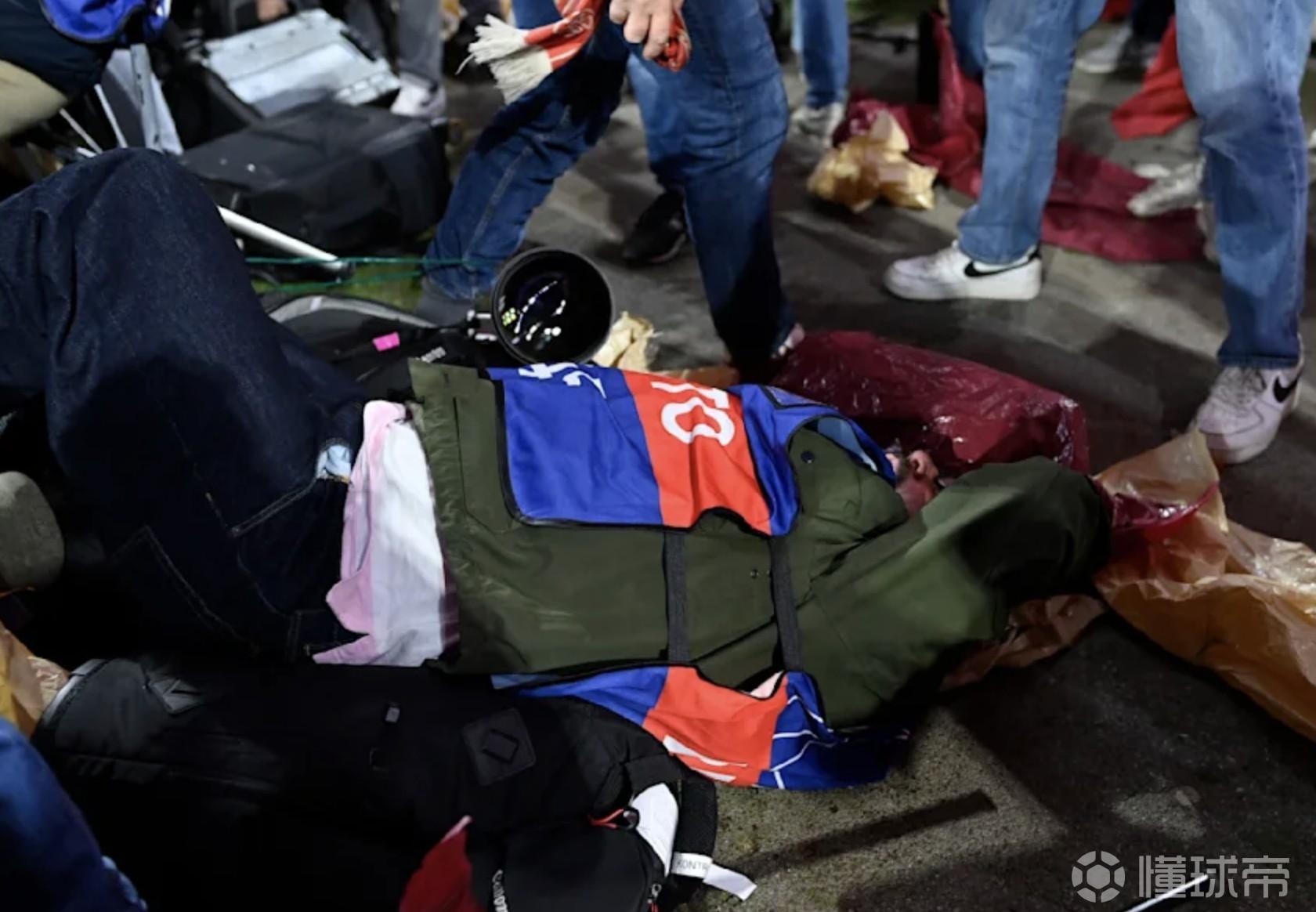 據(jù)現(xiàn)場描述,當醫(yī)護人員發(fā)現(xiàn)他時,他正倒在地上,背景中還能看到紅色的助威橫幅,現(xiàn)場并沒有明顯出血的跡象。