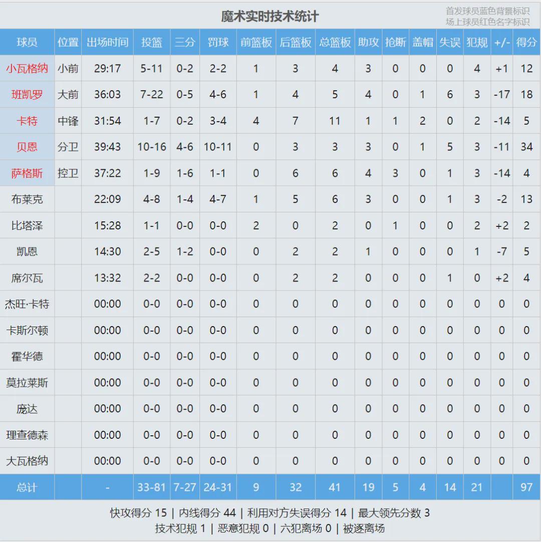 下半場(chǎng)開始,埃奇庫(kù)姆連砍7分,76人一度拉開到11分,這場(chǎng)比賽首次出現(xiàn)兩位數(shù)的分差。貝恩扛著魔術(shù)苦苦追分,前三節(jié)11中8轟下28分。再看看魔術(shù)其他四個(gè)首發(fā):班凱羅17中6、薩格斯7中1、小瓦格納6中1、小卡特也是6中1!