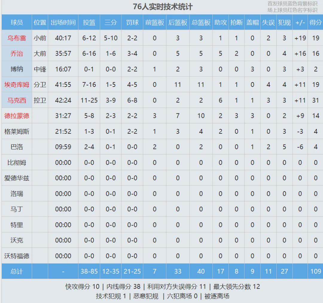 莊神三分殺死比賽,本場(chǎng)三分3中2!全場(chǎng)結(jié)束,76人109-97主場(chǎng)戰(zhàn)勝魔術(shù),季后賽首輪對(duì)陣凱爾特人,魔術(shù)跟黃蜂將爭(zhēng)奪東部第8。馬克西31分2板6助、埃奇庫(kù)姆19分11板、烏布雷19分。貝恩16中10空砍34分3板3助,盡力了!