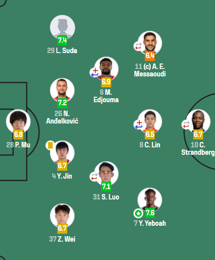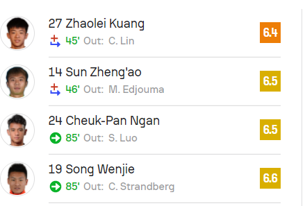 在賽后評(píng)分里,鄺兆鐳得到6.4分,與梅薩烏迪并列全隊(duì)最低。