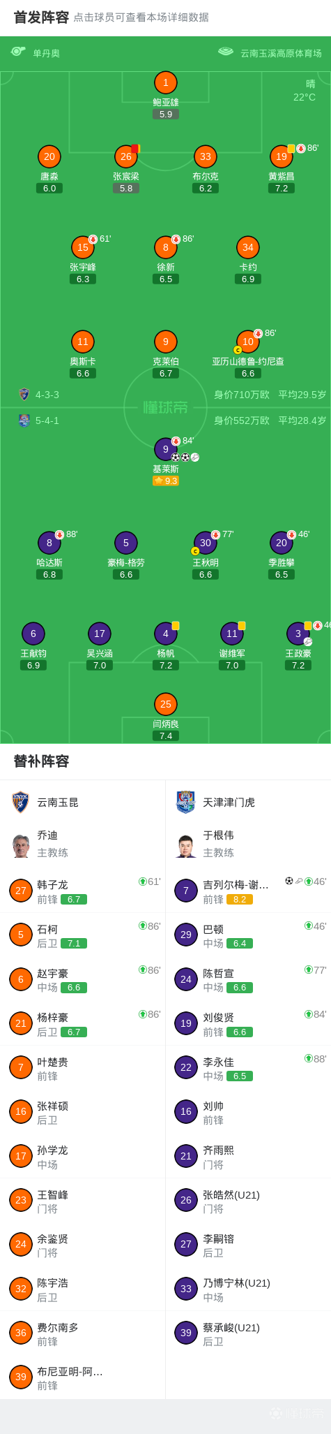 關(guān)鍵事件第41分鐘,王政豪長(zhǎng)傳找身后,基萊斯中場(chǎng)插上破門,津門虎1-0云南