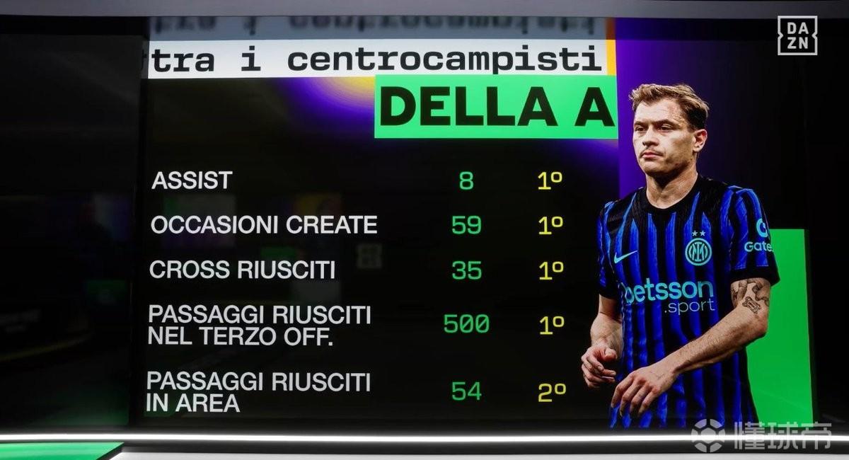 根據(jù)DAZN的統(tǒng)計(jì),巴雷拉本賽季在意甲8次助攻、創(chuàng)造59次機(jī)會(huì)、完成35次成功傳中以及完成500次進(jìn)攻三區(qū)內(nèi)的傳球均位列聯(lián)賽同期所有中場(chǎng)球員的第一位。此外,巴雷拉還有54次傳至禁區(qū)內(nèi)的成功傳球,這位列聯(lián)賽同期所有中場(chǎng)的第二位。