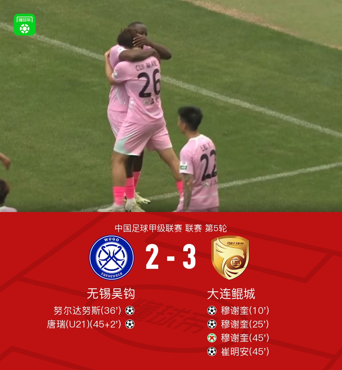 北京時間4月19日中國足球甲級聯(lián)賽 聯(lián)賽 第5輪,無錫吳鉤主場對陣大連鯤城。無錫吳鉤努爾達努斯破門,唐瑞破門。大連鯤城穆謝奎梅開二度,崔明安破門。最終比分無錫吳鉤 2-3 大連鯤城。