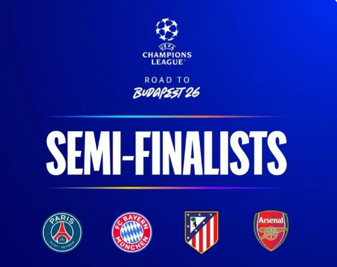 歐冠半決賽對(duì)陣已出爐,四支球隊(duì)分別來(lái)自法甲、德甲、西甲和英超,巴黎圣日耳曼將對(duì)陣拜仁慕尼黑,馬德里競(jìng)技將對(duì)陣阿森納。?