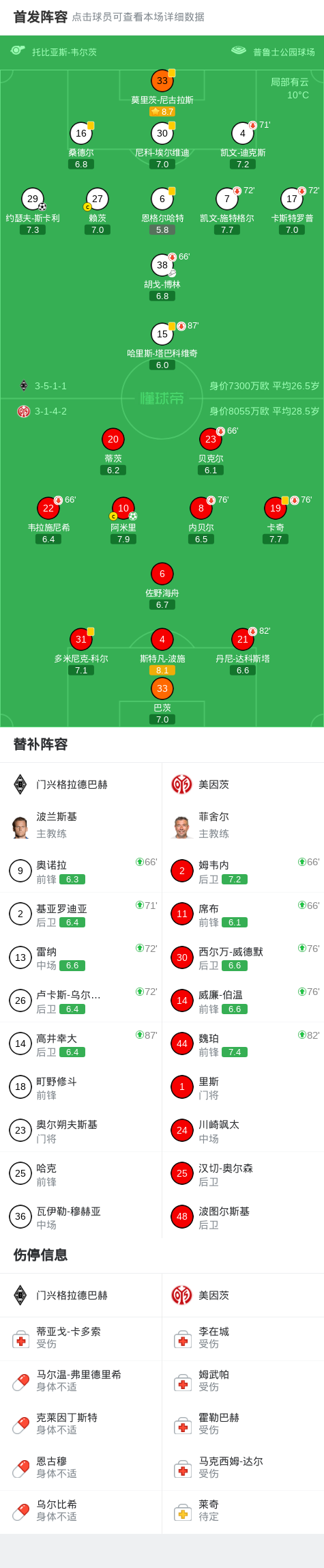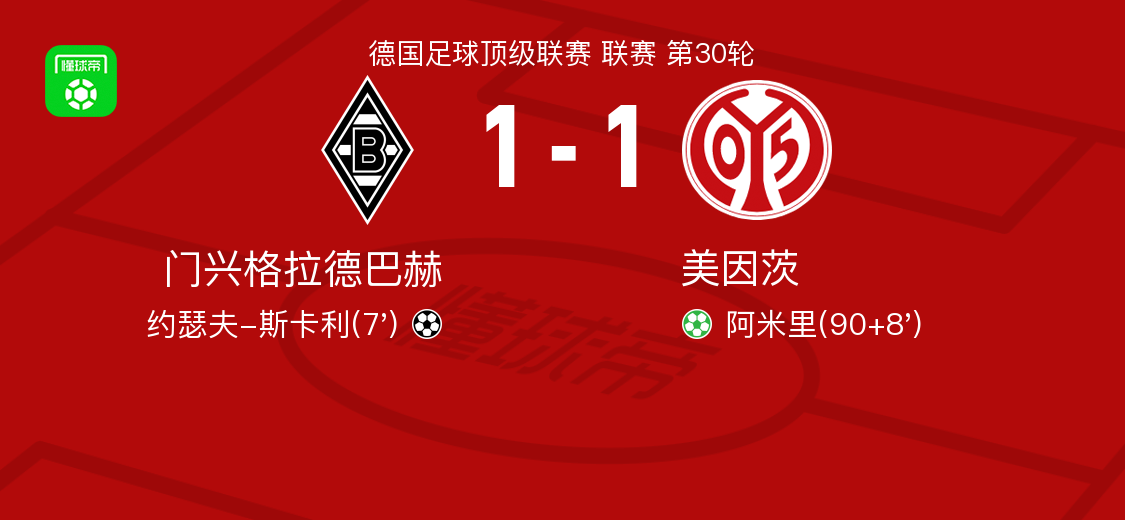 北京時(shí)間4月20日德國(guó)足球頂級(jí)聯(lián)賽 聯(lián)賽 第30輪,門興格拉德巴赫主場(chǎng)對(duì)陣美因茨。門興格拉德巴赫約瑟夫-斯卡利破門。美因茨阿米里破門。最終比分門興格拉德巴赫 1-1 美因茨。