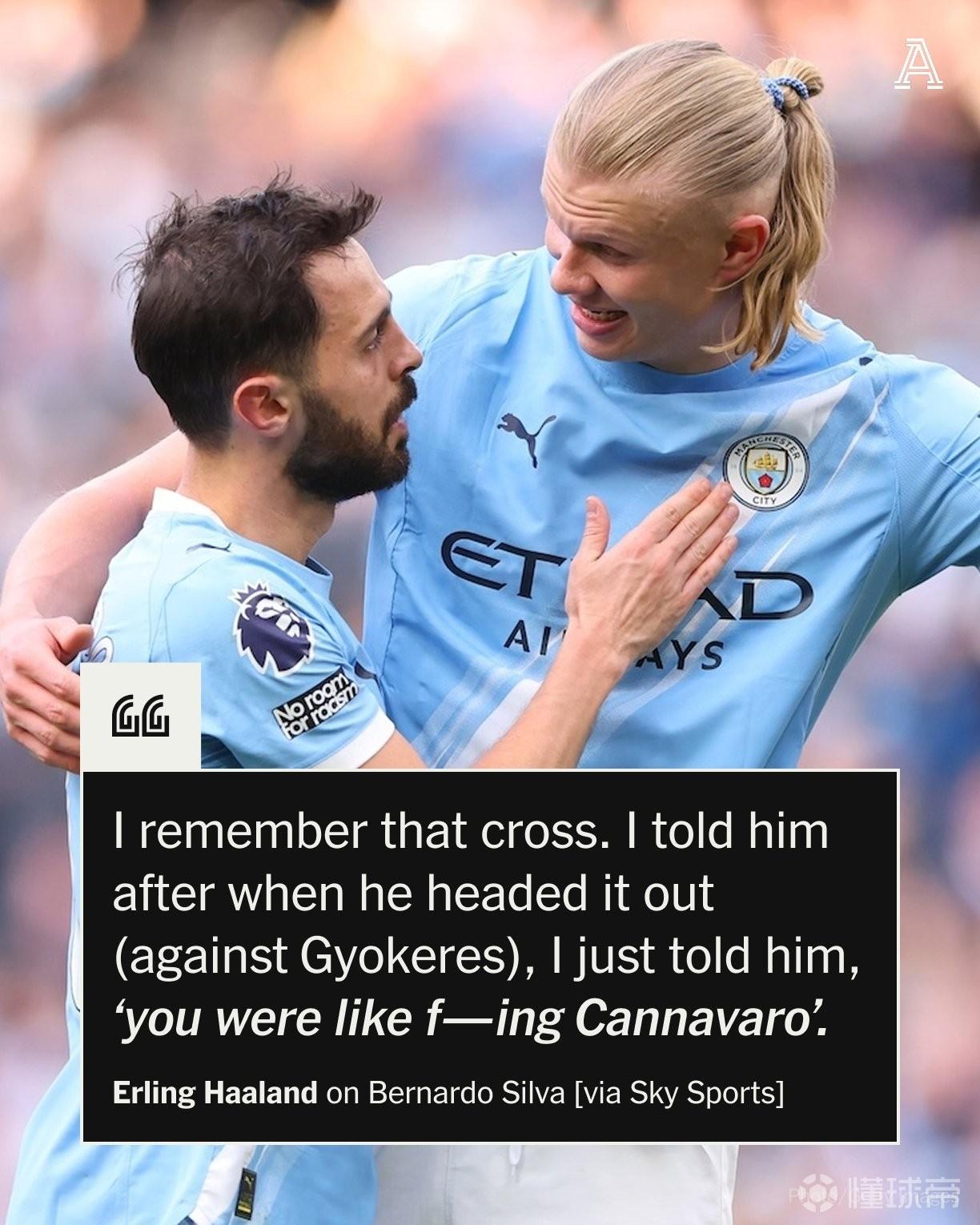 賽后,在接受天空體育采訪,談及伯納多-席爾瓦的關(guān)鍵解圍時(shí),哈蘭德說(shuō)道:“我記得那個(gè)解圍,他頭球解圍后我跟他說(shuō),你剛才就像‘該死的卡納瓦羅’?!?/p>