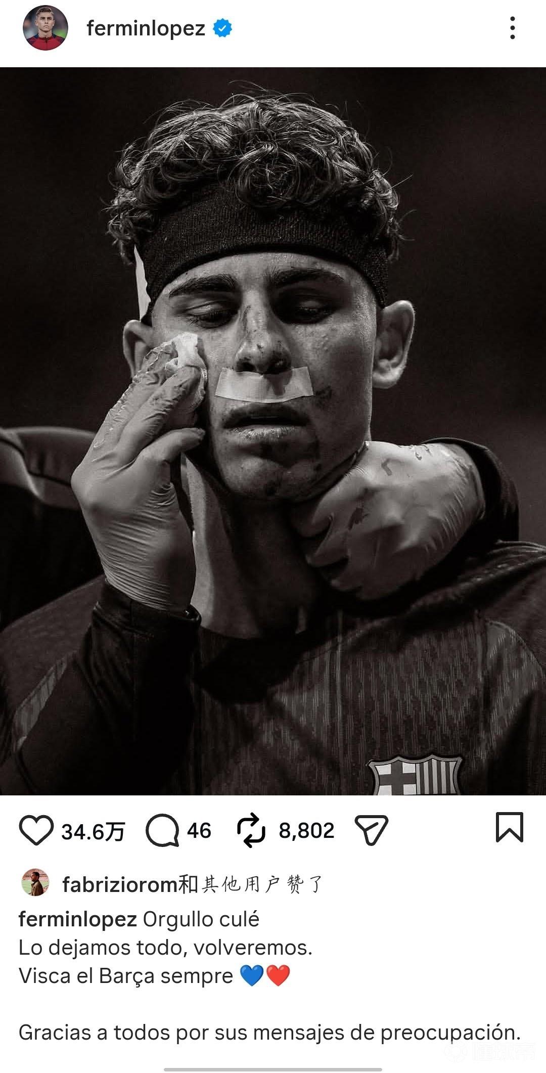 北京時(shí)間4月15日,歐冠1/4決賽次回合比賽,巴薩客場(chǎng)2-1馬競(jìng),總比分2-3不敵馬競(jìng)無緣歐冠四強(qiáng)。賽后費(fèi)爾明在社媒曬臉部受傷照并發(fā)文:“身為巴薩球迷的驕傲。我們付出了一切,我們會(huì)回來的。巴薩永遠(yuǎn)萬歲。感謝大家發(fā)來的關(guān)心的消息?!?/p>