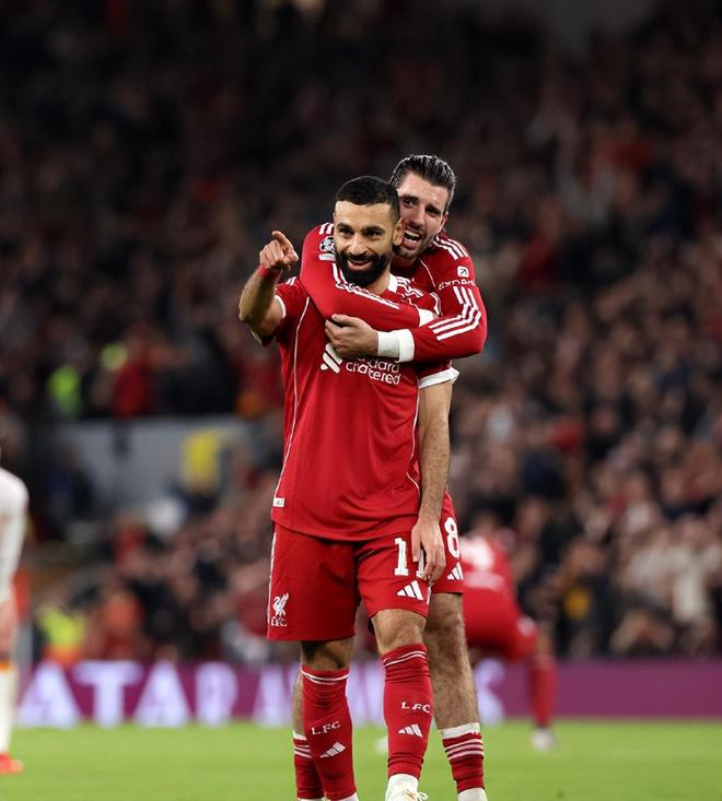 第62分鐘,薩拉赫與維爾茨撞墻配合后,終于打出昔日標(biāo)志性的內(nèi)切兜射,皮球直掛球門死角,4:0,總比分4:1!這是薩拉赫在歐冠打進(jìn)的整整50球,也是非洲球員歷史上首位達(dá)到這個(gè)成就的成員。第67分鐘,麥卡利斯特遠(yuǎn)射再次擊中了立柱,索博二點(diǎn)組織斜塞,薩拉赫倒三角回敲,維爾茨低射被撲出,?;倏私嚯x補(bǔ)射擦著橫梁出界。