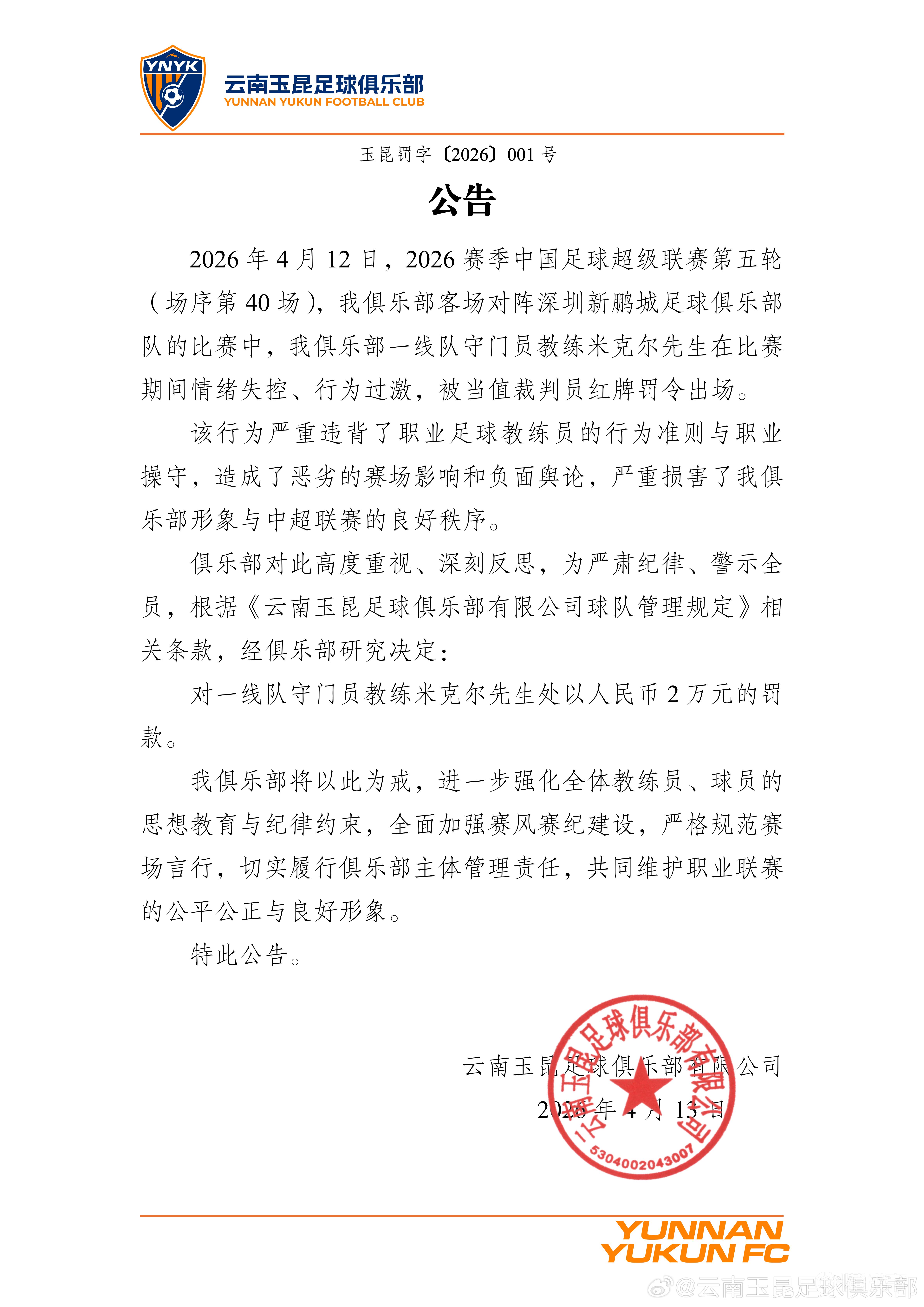 關(guān)于我俱樂部一線隊(duì)守門員教練米克爾先生相關(guān)處罰公...